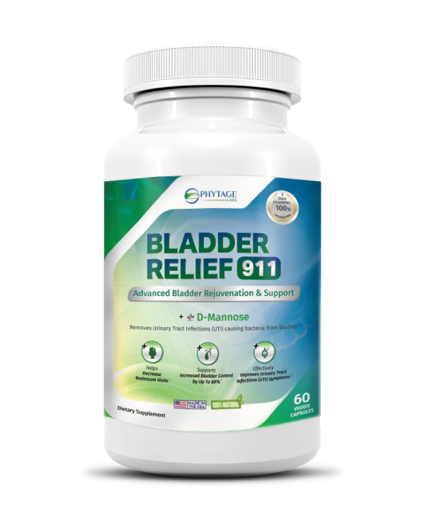 Bladder Relief 911 from Phytage Labs is a natural supplement designed to support bladder health, promote urinary comfort, and help reduce frequent urgency. Its unique blend of herbal and plant-based ingredients works to strengthen bladder function, flush out bacteria, and maintain overall urinary tract wellness.