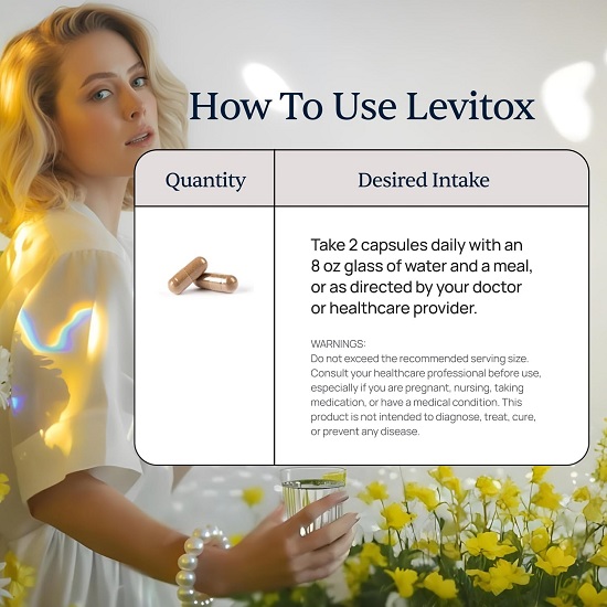 Levitox is simple to incorporate into your daily routine. Just take two small capsules each day with water to help support your liver and maintain your body’s natural metabolic processes. With consistent use as part of a balanced lifestyle, Levitox can help promote better digestion, improved energy levels, and overall wellness support.